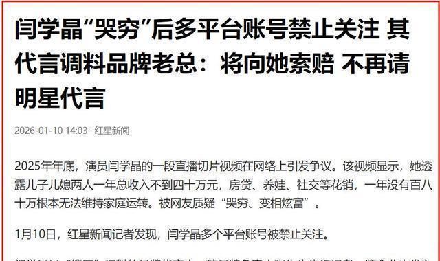 “我刷个短视频就想图个乐,结果明星先跟我哭穷?”——1月3号那晚,闫学晶在直播间一句“倒贴钱送手机”,直接把网友的血压拉到爆。镜头外是她价值半个亿的北京别墅,镜头里她却皱着眉说“真不挣钱”。反差太大,弹幕瞬间翻车:你住豪宅开揽胜,跟我们喊累?第二天,#闫学晶哭穷#冲上榜一,品牌方连夜加班开会,第三天统厨调料就把她头像从包装抠下来,生产线说停就停,几十万现货直接报废。