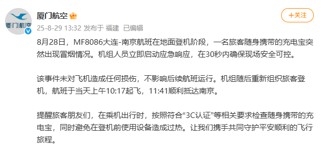 新京报讯 据@厦门航空微博消息,8月28日,MF8086大连-南京航班在地面登机阶段,一名旅客随身携带的充电宝突然出现冒烟情况。机组人员立即启动应急响应,在30秒内确保现场安全可控。